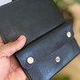 - Fechamento: Aba com tira de couro e botão de pressão metálico